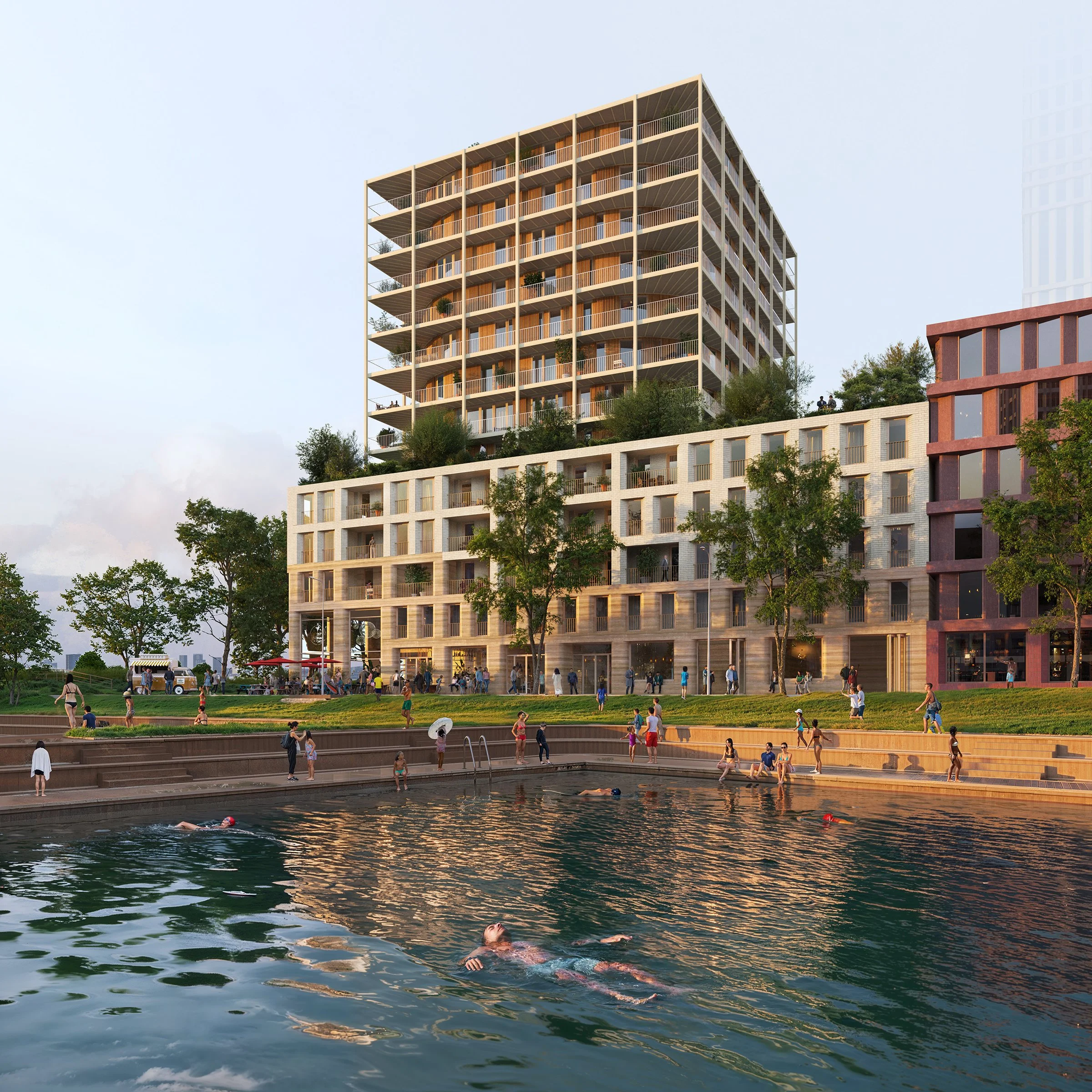 ‘Sociaal’ en ‘Klimaat’ komen samen in Radius: een betaalbaar woonprogramma met een groot aandeel middenhuur, gecombineerd met biobased en circulair bouwen op schaal. Tegelijk zorgen de levendige plint en de collectieve ruimtes voor ontmoeting en sociale verbinding.